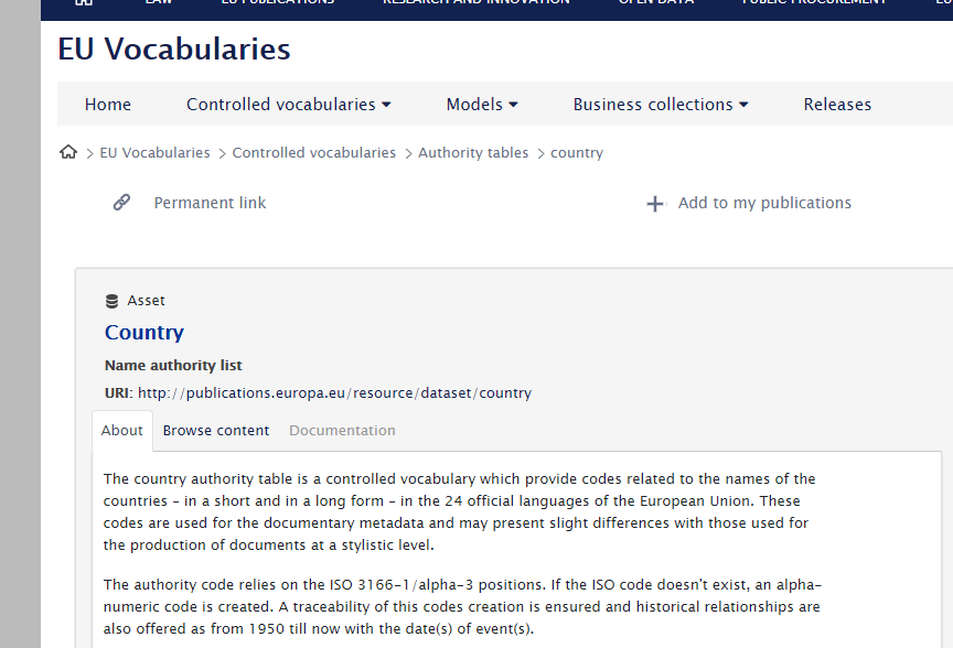 Named Authority Lists consists of harmonised and standardised codes and associated labels managed by the Publications Office for inter-institutional data exchange and consumption by various systems