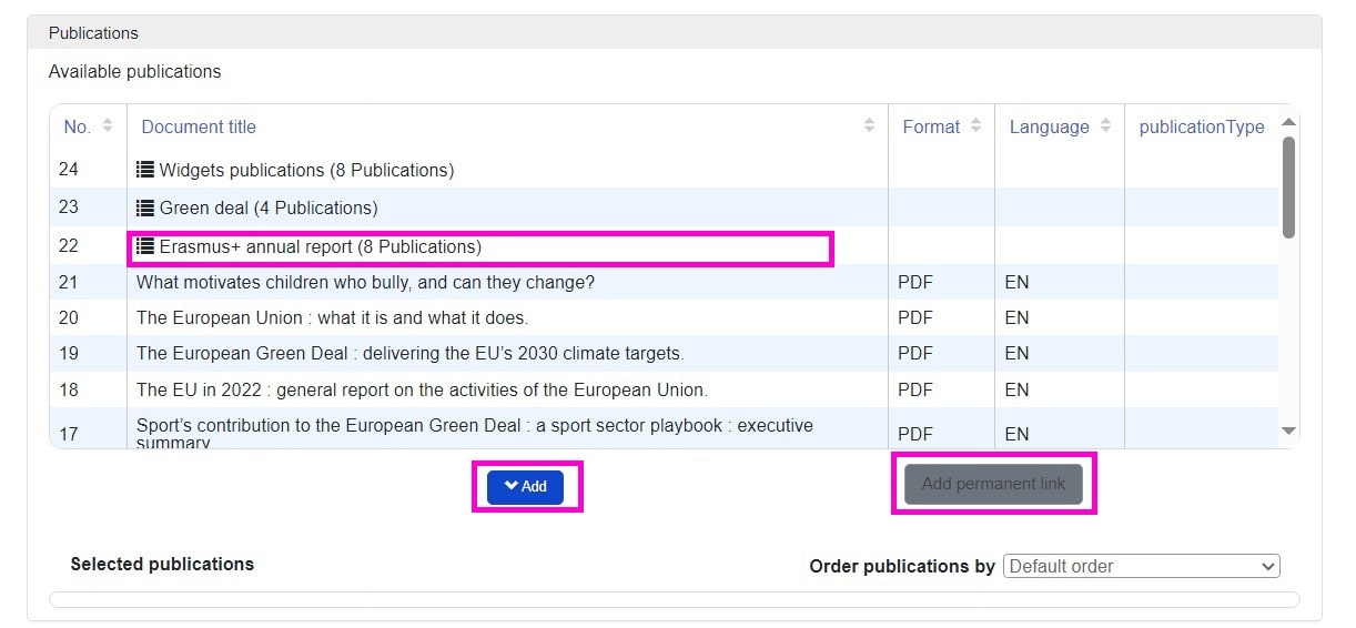 The selected publications widget displays a list of preselected publications or legal documents. The preview order and the content of your preselected list can be modified at any time with a few simple clicks. Supporting all 24 official languages of the EU, this widget is both user-friendly and cost-free.