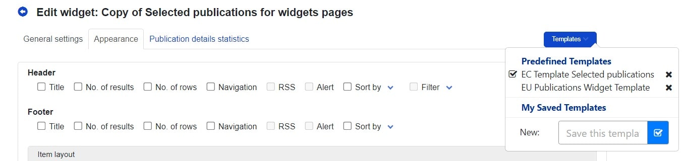 Note that there are two ways to add publications to this widget. The first is to create and save a list of publications in your profile. The second is via the "Add URL" button in the widget creator, URLs should be a property of the Publications Office portal. Example: